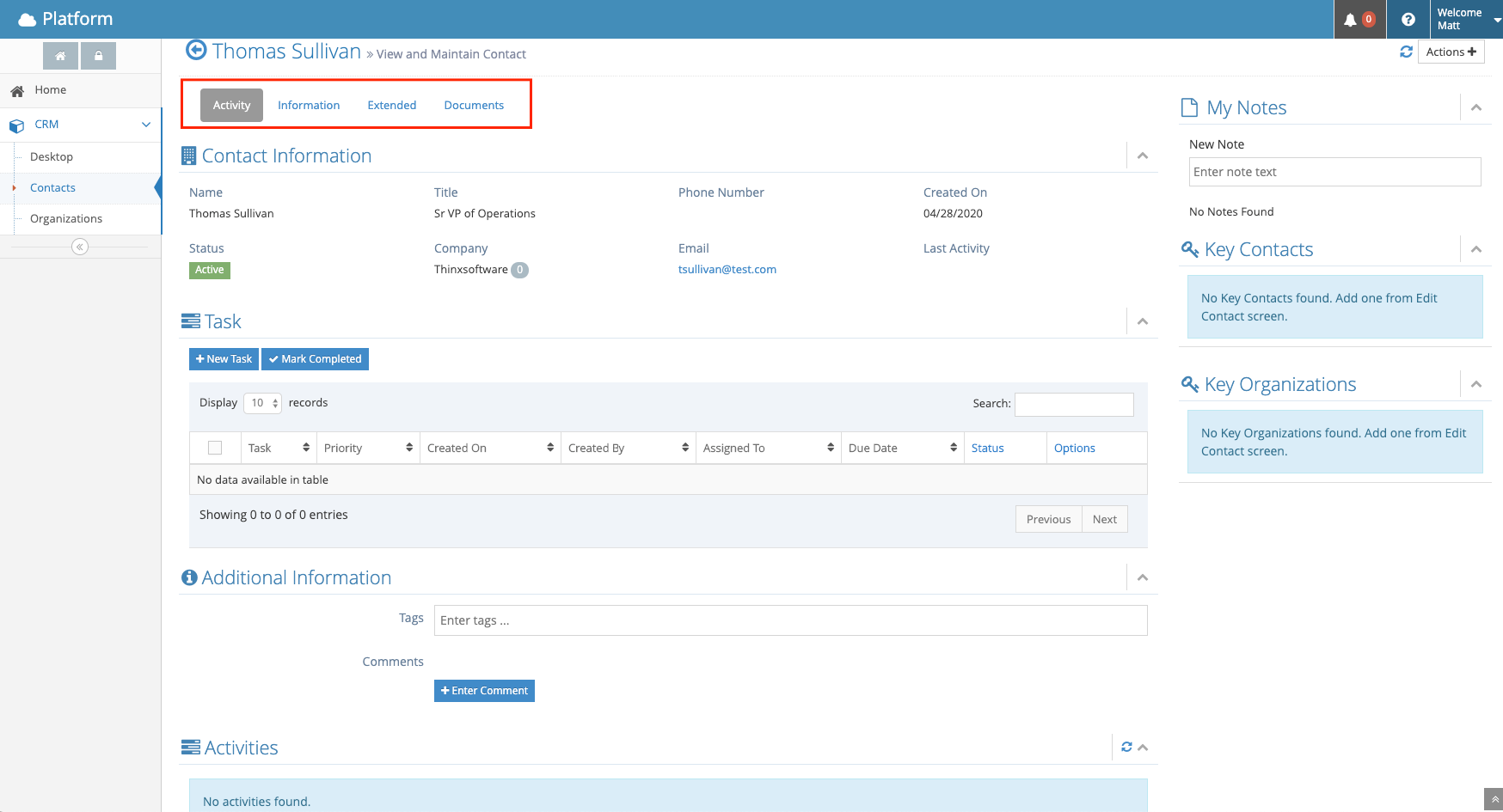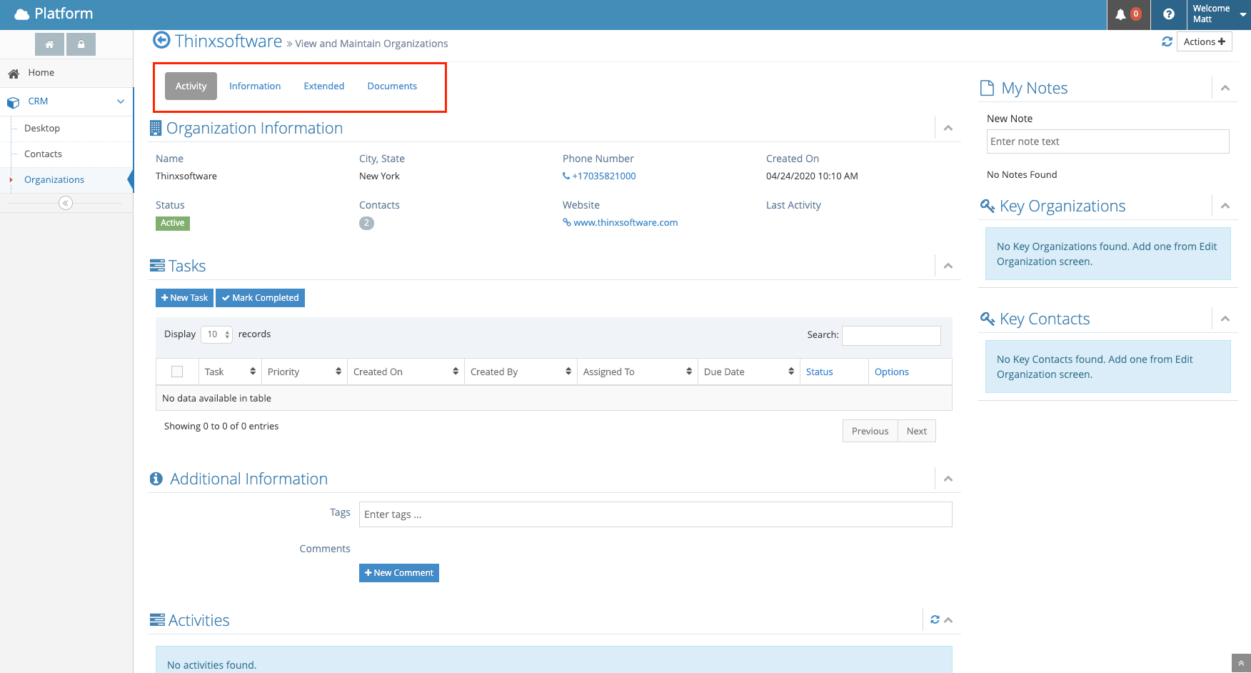 The Activity tab displays a quick summary of tasks, comments, and any activity regarding the selected organization. The tab also contains a summary of the organization’s contact information at the top. This summary information appears on all tabs. The Task section displays any tasks opened on the organization. This section integrates with the Thinx! Task module. In this section, CRM users can create follow up tasks, such as “Follow up with Sales Proposal,” and assign the task to themselves or another CRM User. The comment section displays any comment made regarding the organization, including the audit trail details. CRM users may add a descriptive tag on any organization as well. The Activity section displays a timeline of any action taken.