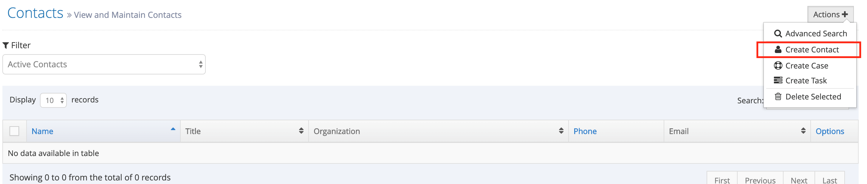 Contacts and Organizations can be created from their respective landing page using the Actions menu. For example, to create a contact open the Actions menu on the Contact Landing page and select the Create Contact menu item.