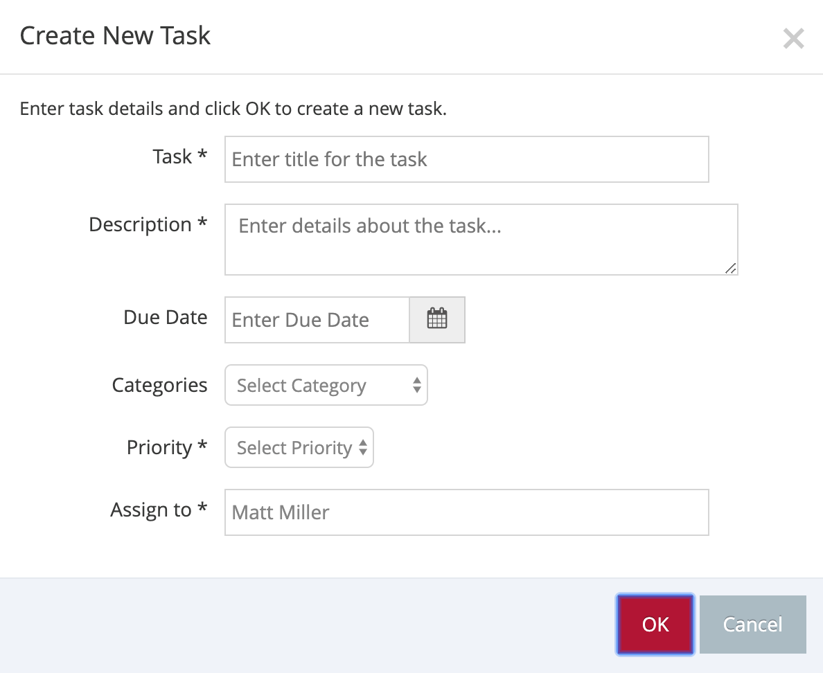 | Tasks Categories must be configured first in the Task module before they are available in the Create New Task popup. |