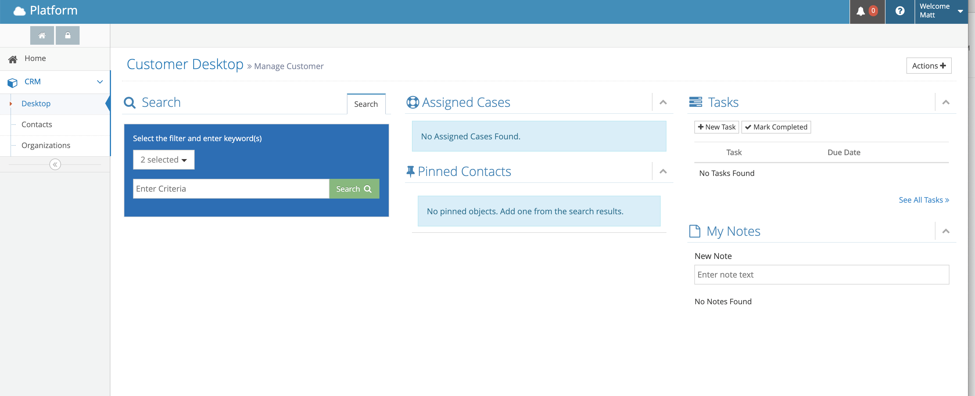 The Desktop page is intended to be the landing page for CRM. The page contains several widgets enabling end users to quickly find and manage contact and organization objects, manage any assigned tasks, and create or mange any personal notes. The widgets on the Desktop page will be discussed in further detail later in section 3.
