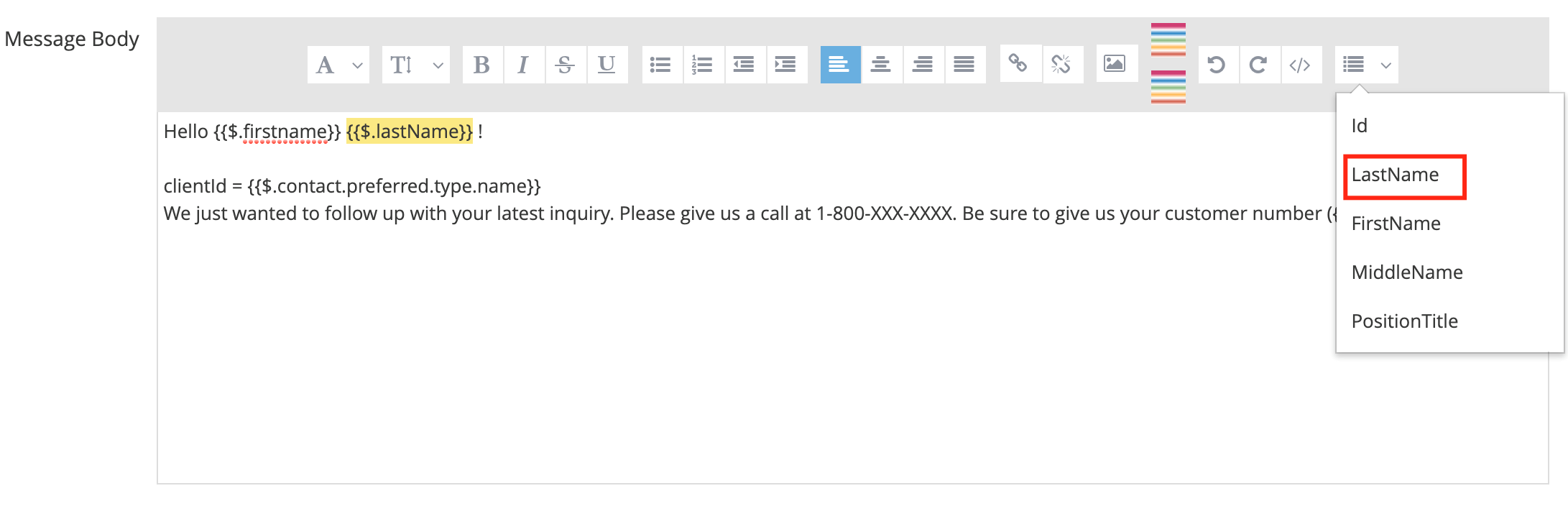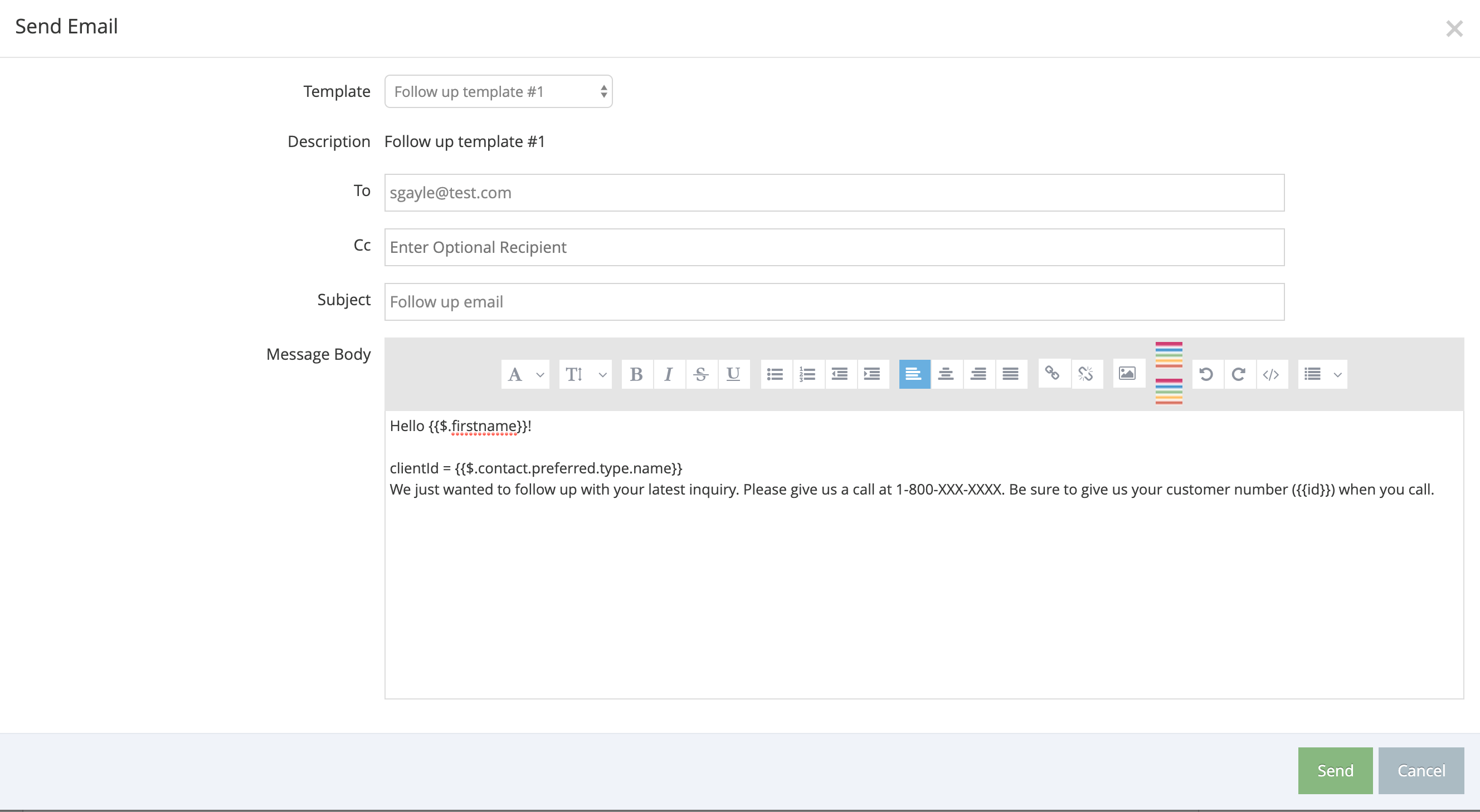 The Subject and Message Body may be edited before being sent. The Message Body makes use of variable substitution of contact/organization at the time of sending. These variables represent placeholders for contact/organization attributes of the current object. The message template may have some of these variables included in the body already. All object attributes may be substituted in the body using the given format: