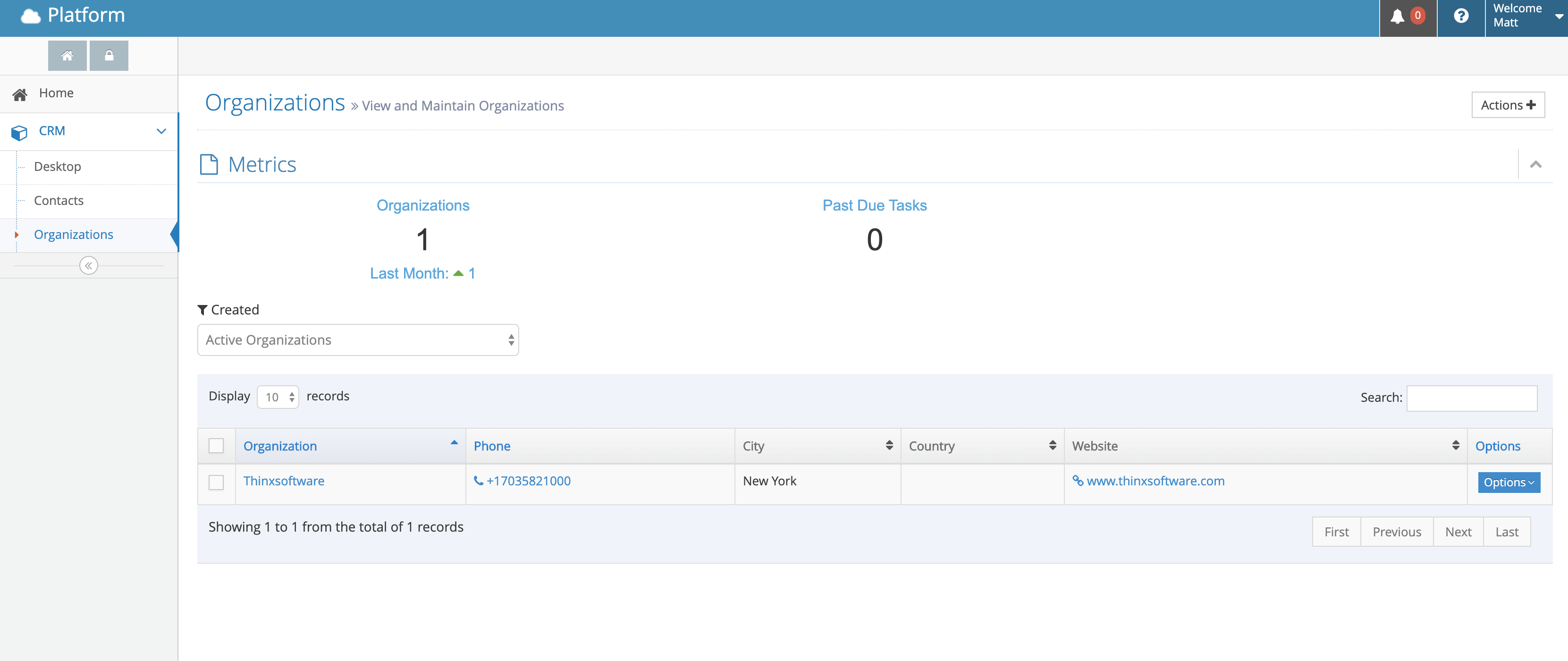 The Organization Landing page lists all organization currently in the system and is very similar to the Contacts landing page. End users can scroll through the list of organizations or search for organizations by name. Additionally, several filters are provided that help to restrict the list of organizations available.