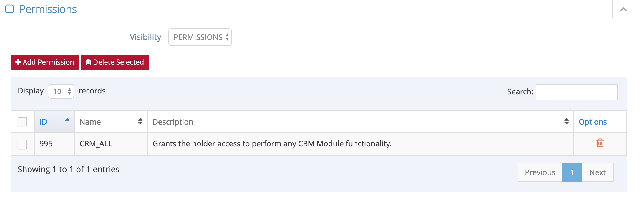 Click the Add Permissions button to display the Add Permission popup. This popup will be populated with the permission set for the CRM module. Select the permission(s) which you wish to assign to the current contact and click the Add button.